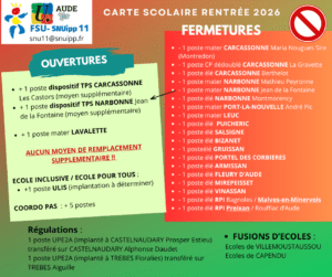 Si l’on peut admettre certains points de satisfaction comme l’ouverture de deux dispositifs TPS, la création d’une classe ULIS, ou l’ouverture d’une classe sur Lavalette, nous déplorons la non prise en compte de la situation des écoles pour qui une fermeture a été maintenue, en particulier celle de Salsigne. Nous regrettons également le maintien du projet de fusion sur les écoles de Villemoustaussou.